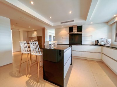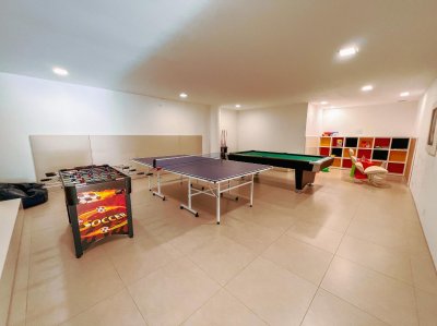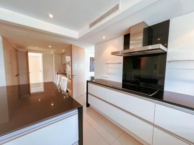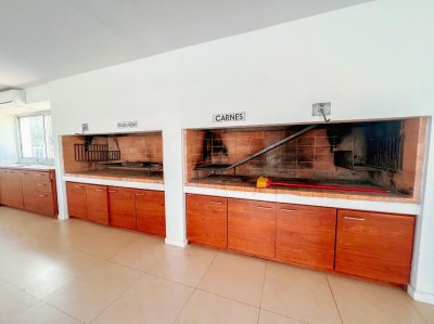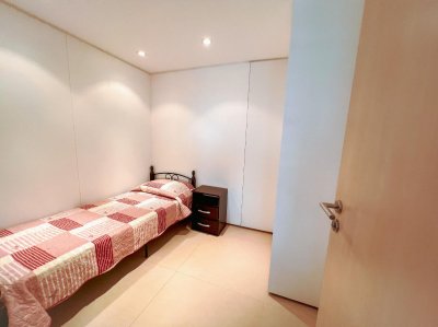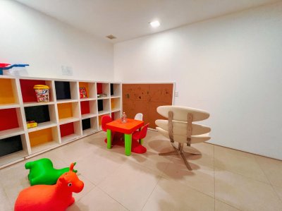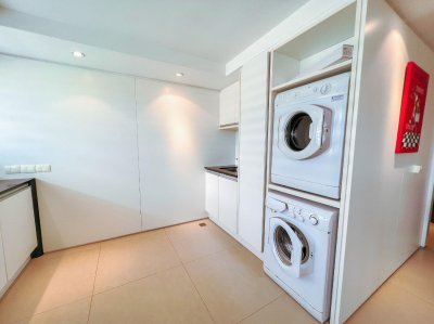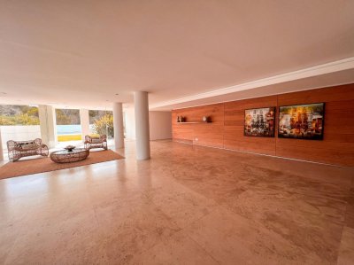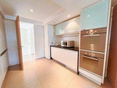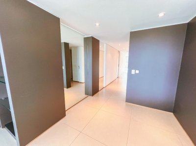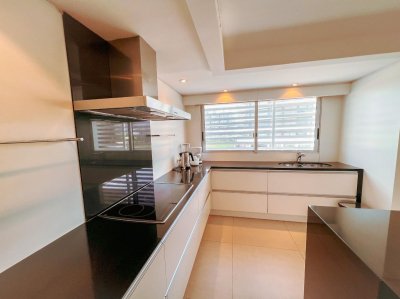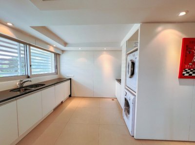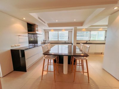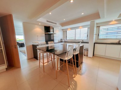 Área de comedor definida con puerta de acceso a la cocina, gran área de cocina con isla y lavandería, dependencia de servicio y baño. La unidad cuenta con todas las áreas soleadas, aire acondicionado central y calefacción por losa radiante.