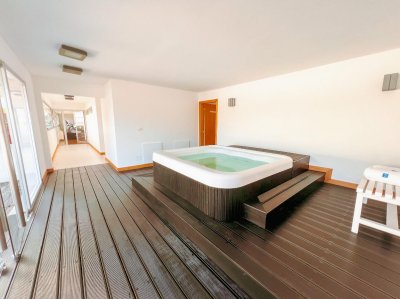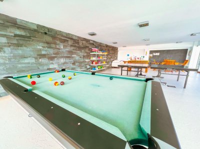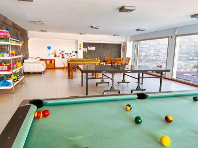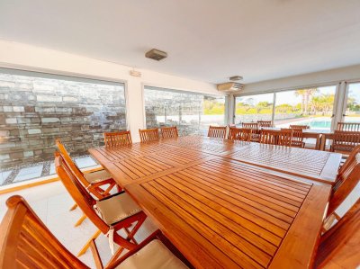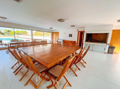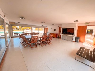 Amplio salón común con parrillero con vista a la piscina y cristalería disponible