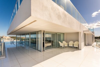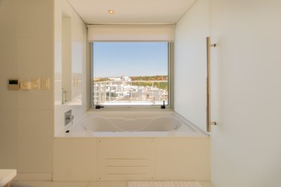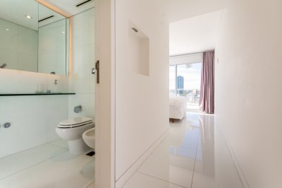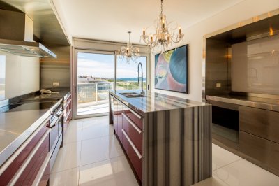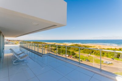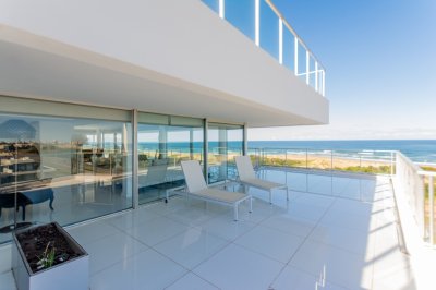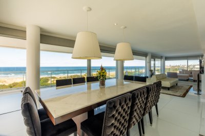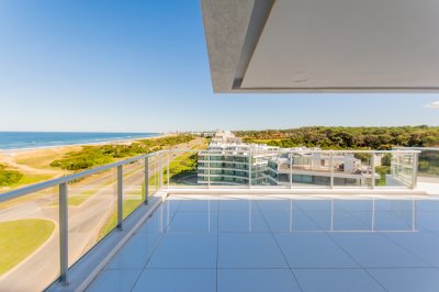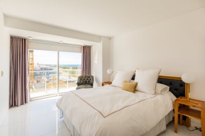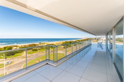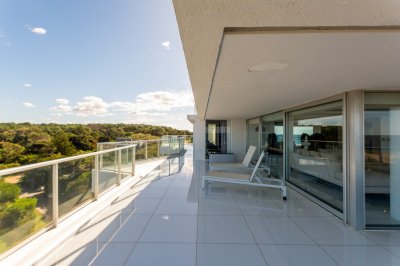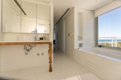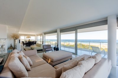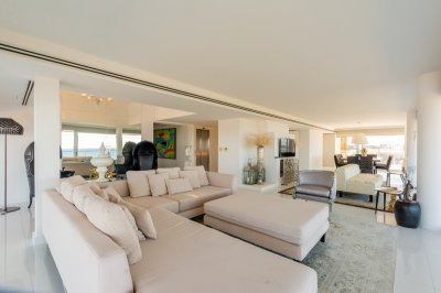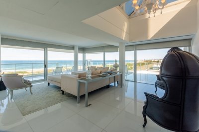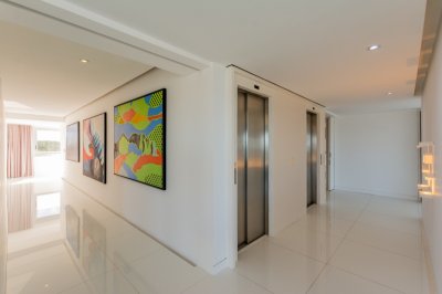 Excelente planta especial, dúplex, cuenta con 4 dormitorios en suite, 5 baños, 1 toilette, living amplio con vista despejada al mar, comedor, cocina, amplias terrazas perimetrales. 2 ascensores que llegan directo al piso y a la planta superior de uso exclusivo con parrillero y piscina propia. 3 garages en subsuelo. Decorado por Philippe Starck Coordine su visita!